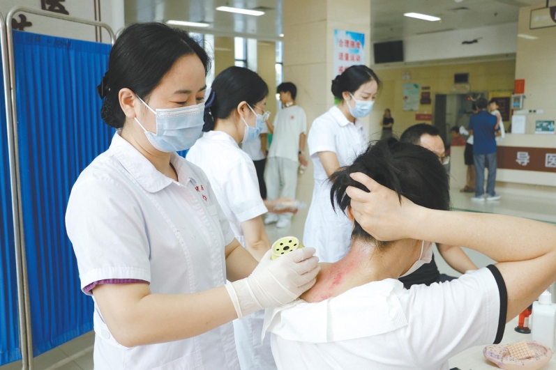 活动现场特别设置八段锦展演,吸引众多市民参与学习。“市民可以一边就诊一边体验感受传统中医药文化。”医院相关负责人介绍,随着越来越多的市民爱上中医养生,医院特意在等候就诊区域的另一侧设置了中医养生区,药香氤氲,艾灸、拔罐、刮痧等“养生标配”引得许多市民争相排队体验。此外,医院还提供了清咽利嗓茶、乌梅汤等夏日适宜养生饮品免费品尝。(记者 罗婉婷 实习生 金甜)